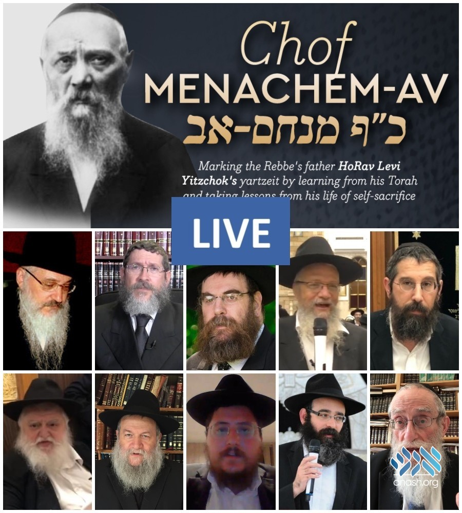 Join Live at 7:00 PM ET: The English segment of Vaad Or Vechom’s Chof Av broadcast will feature speakers on the life and works of Harav Levi Yitzchak, followed by a farbrengen with Rabbis Shlomo Zarchi, Nochum Kaplan and Zushe Winner.