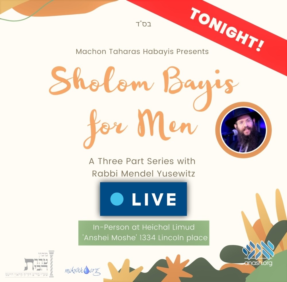 Live tonight at 8:00 PM: The first shiur in a series on shalom bayis for men, given by Rabbi Mendel Yusewitz will take place tonight in Crown Heights and be broadcast live.