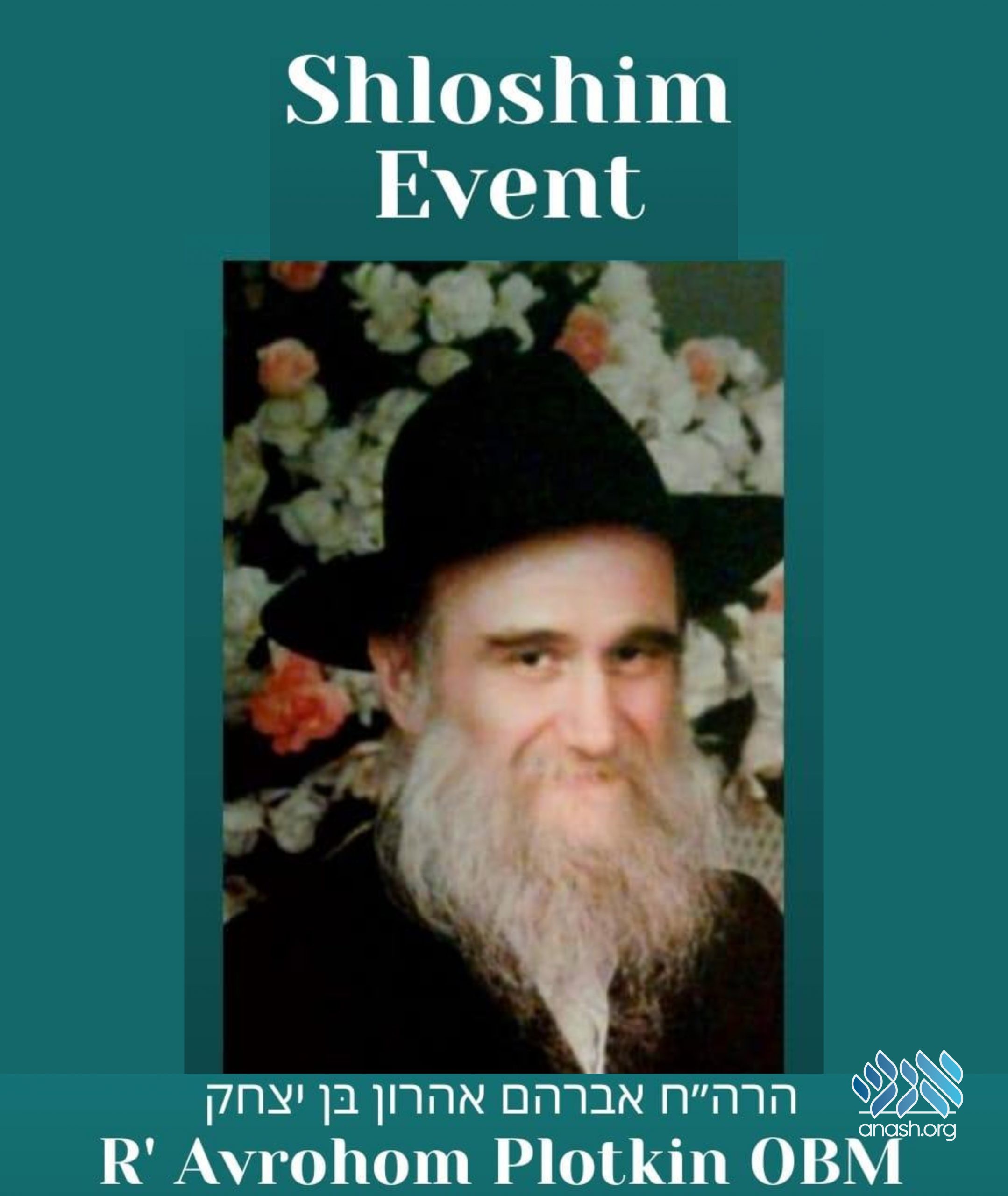 The shloshim of R’ Avrohom Plotkin will be marked with an online event with speakers from the West Coast and the beginning of a Sefer Torah.