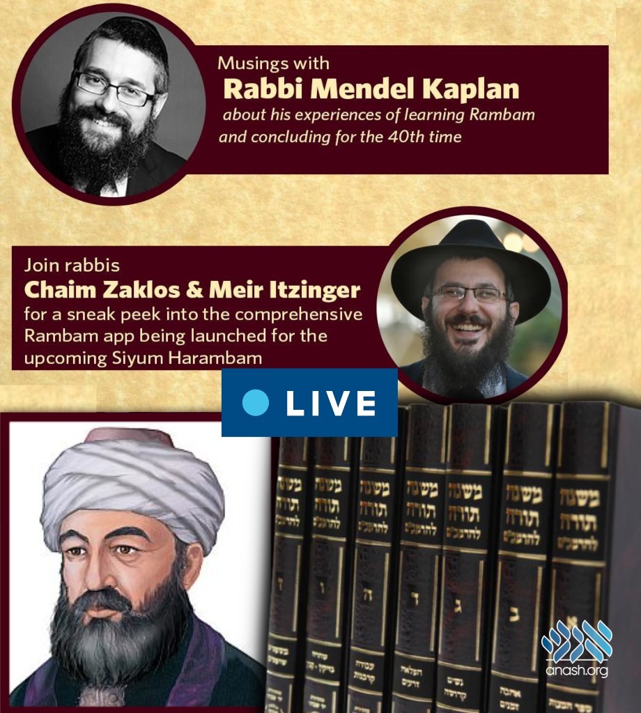 Join Live at 9:00 PM ET: A Siyum will be held on the Rambam’s Sefer Mishpotim, addressed by Rabbi Mendel Kaplan of Chabad of Flamingo and others. A special sneak peak will be given into a new upcoming Rambam app.