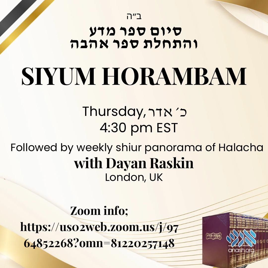 Chassidim the world over have completed the study of Sefer Hamada of the Rambam and the beginning of Sefer Ahava. An international Siyum will feature Dayan Levi Yitzchok Raskin, rov of Anash in London, England.