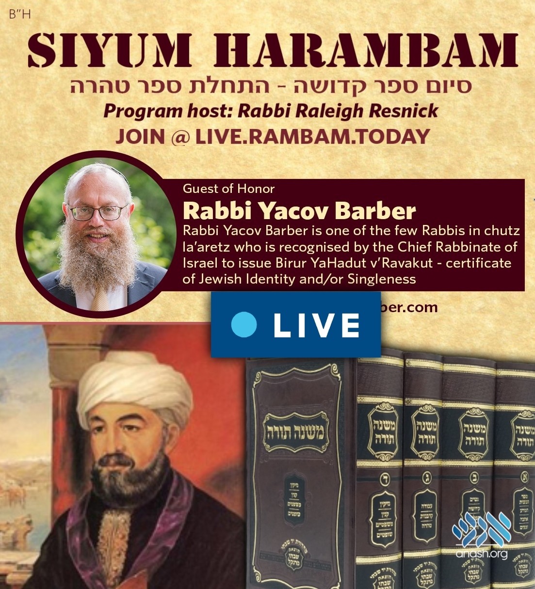 Live Sunday at 9:00 PM ET: An international Siyum celebrating the completion of the Rambam’s Sefer Kedusha will feature Rabbi Yacov Barber, a recognized expert on birur hayahadus.