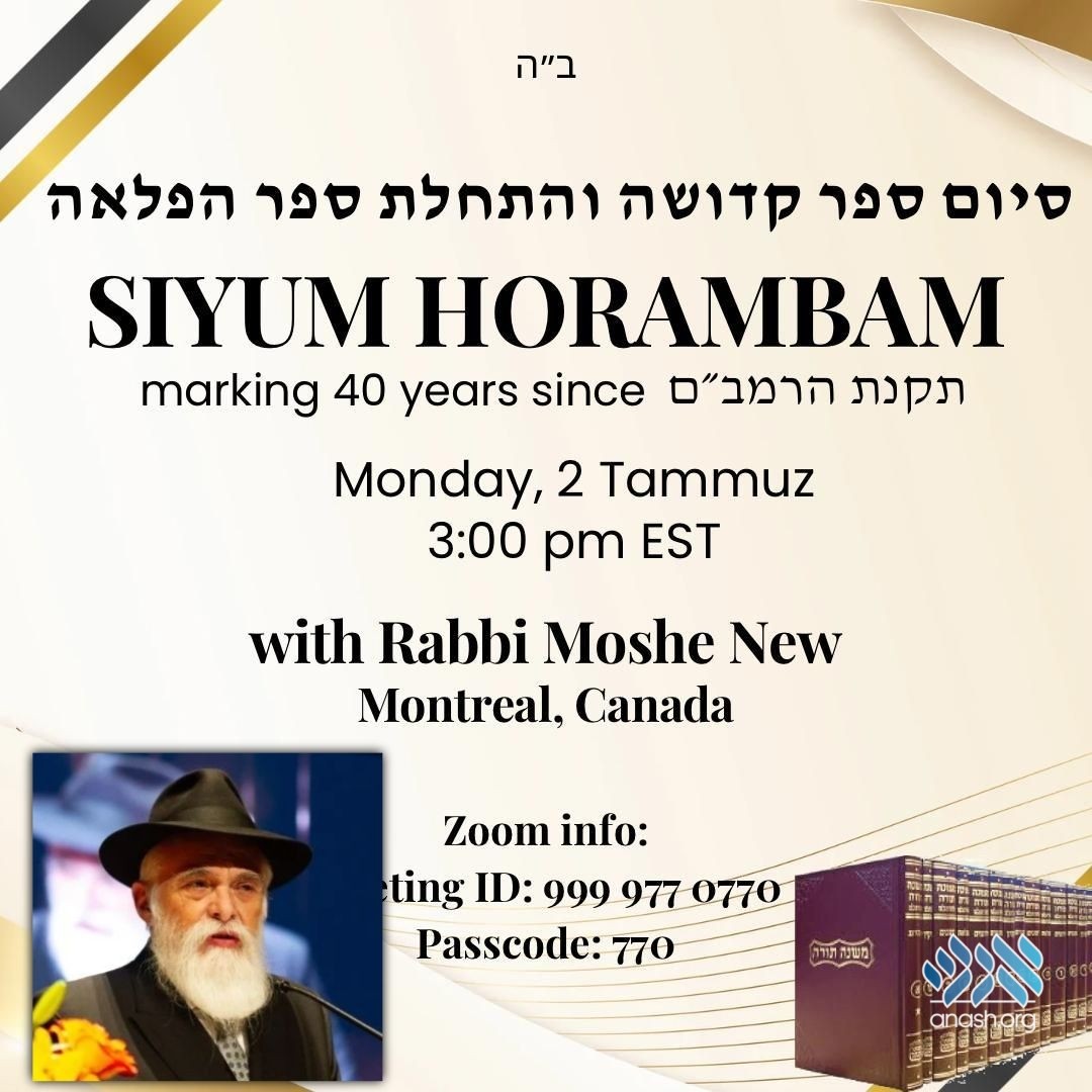 Chassidim the world over have completed the study of Sefer Kedusha of the Rambam. An international Siyum will feature Rabbi Moshe New of the Montreal Torah Center.