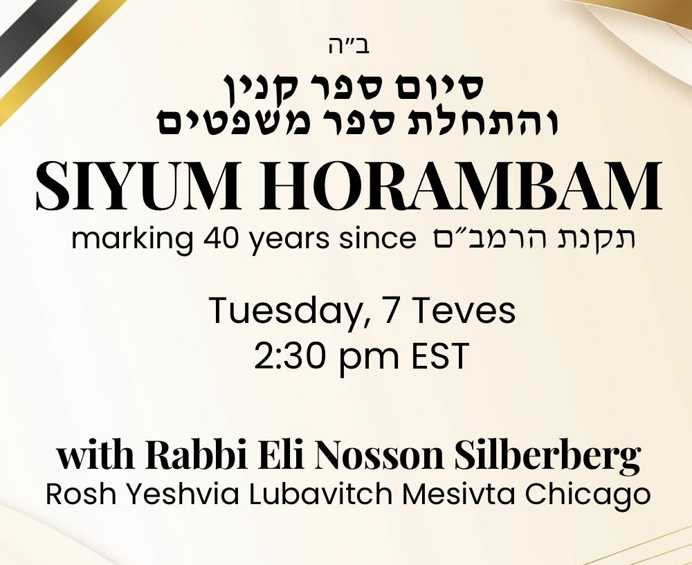 Live at 2:30 PM EST: An international Siyum celebrating the completion of the Rambam’s Sefer Kinyan will feature Rabbi Eli Nosson Silberberg, Rosh Yeshiva Lubavitch Mesivta Chicago.