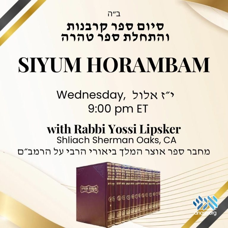 Live at 9:00 PM ET: An international Siyum celebrating the completion of the Rambam’s Sefer Korbanos will feature Rabbi Yossi Lipskier, shliach in Sherman Oaks, CA, and author of set of Rebbe’s biurim on Rambam.