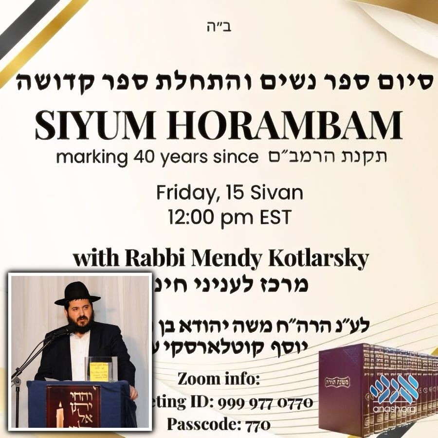 Live on Friday at 12:00 PM ET: An international Siyum celebrating the completion of the Rambam’s Sefer Nashim will feature Rabbi Mendy Kotlarsky of Merkos L’Inyonei Chinuch in memory of his father, Rabbi Moshe Kotlarsky AH.