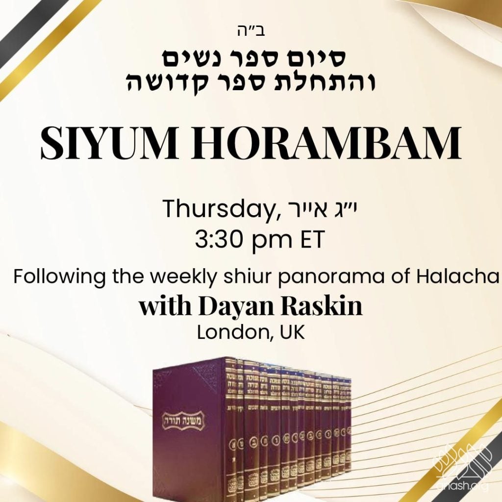 Join at 3:30 PM ET: An international Siyum celebrating the completion of the Rambam’s Sefer Nashim will feature Dayan Levi Yitzchok Raskin, Rov of Anash in London, following his weekly shiur Panorama of Halacha.