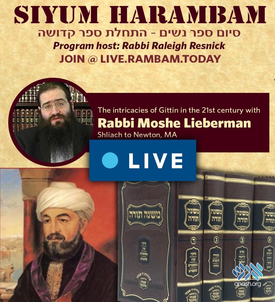 Watch a replay: An international Siyum celebrating the completion of Sefer Nashim will feature Rabbi Moshe Lieberman, on the intricacies of Gittin and Kiddushin in the 21st century.