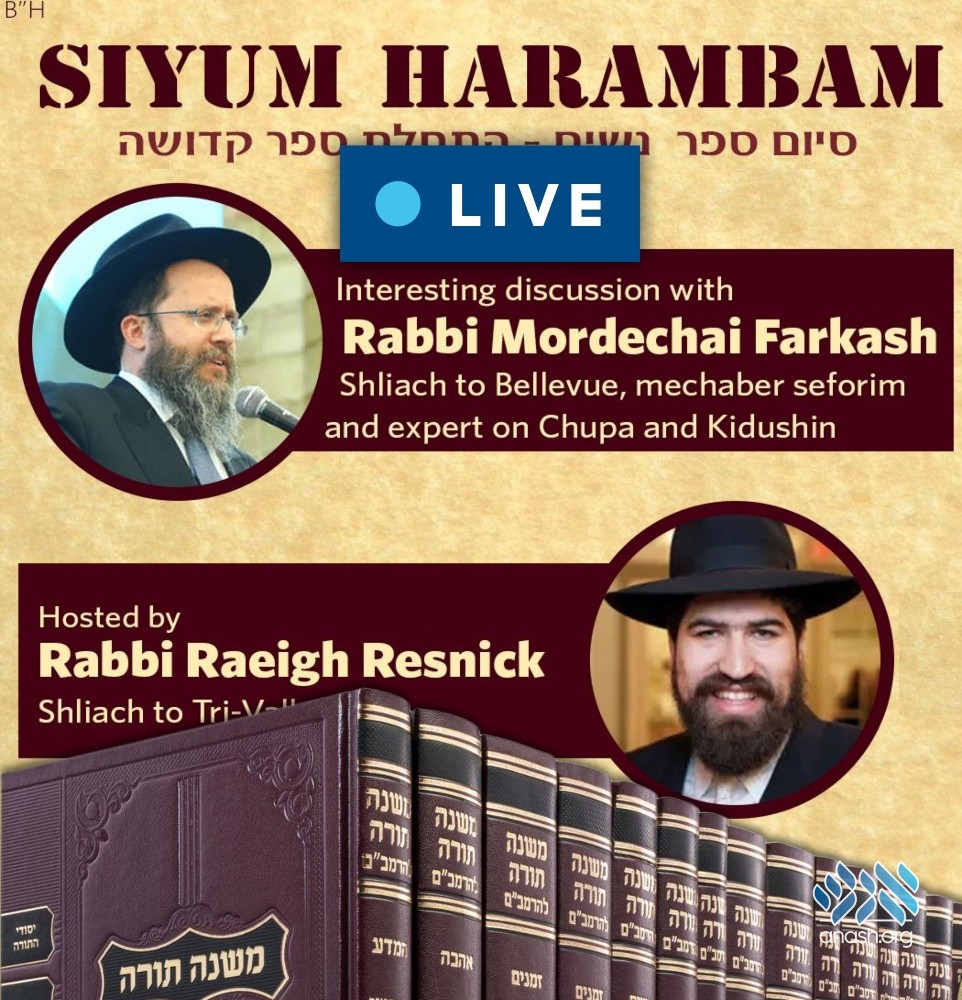 Join Live at 9:00 PM ET: A Siyum will be held on the Rambam’s Sefer Noshim, the fourth book of Mishna Torah, addressed by Rabbi Mordechai Farkash and hosted by Rabbi Raleigh Resnick.