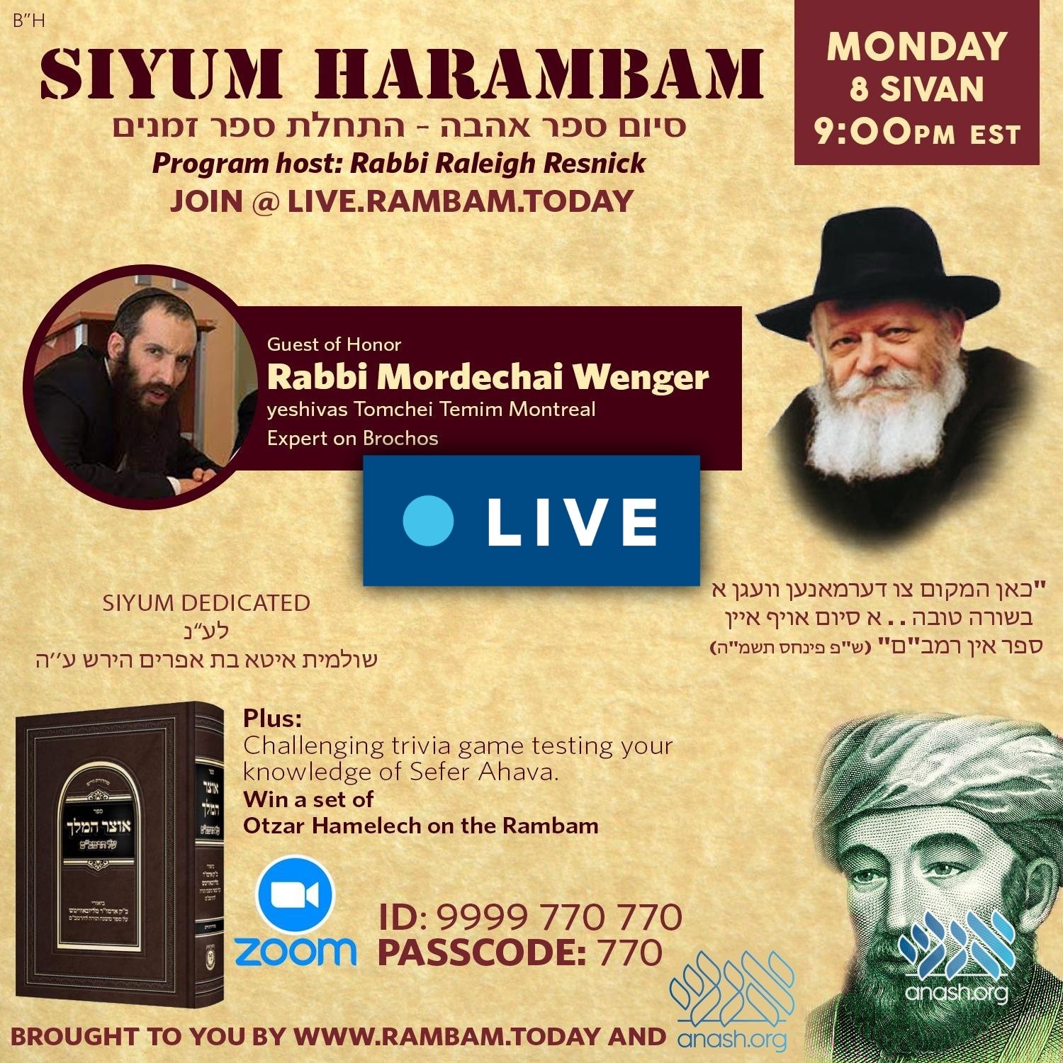 Live Monday at 9:00 PM ET: An international Siyum celebrating the completion of the Rambam’s Sefer Ahava will feature Rabbi Mordechai Wenger of Yeshiva Tomchei Tmimim Montreal, a renowned expert on brachos.