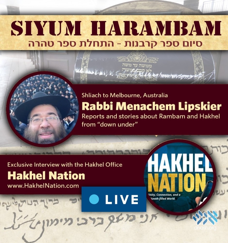 Watch a replay: A virtual siyum will celebrate the completion of the Rambam’s Sefer Korbanos, featuring Melbourne Shliach Rabbi Menachem Lipskier and an interview with the Hakhel Office.