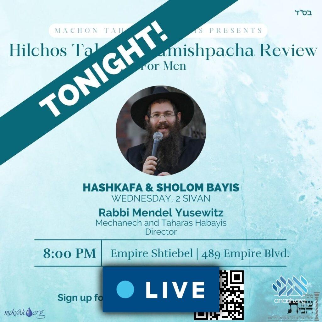Live at 8:00 PM: The final Shiur from Machon ‘Taharas Habayis’ new Halacha series for married men will take place tonight at Empire Shteibel. Shiur 5 with Rabbi Mendel Yusewitz on “Hashkafa & Sholom Bayis”.