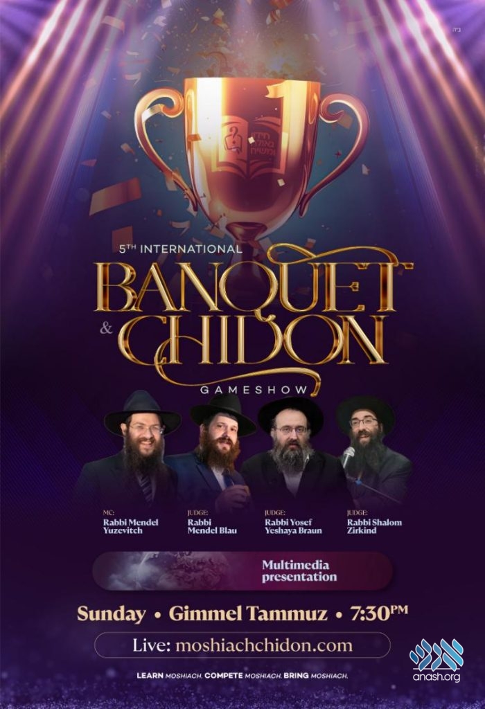 The International Moshiach Chidon Banquet, celebrating the exceptional learning of Mesivta Bochurim in Inyonei Geulah U’Moshiach, will take place tonight, led by Crown Heights Rov Rabbi Yosef Braun, Oholei Torah Dean Rabbi Mendel Blau, and Geulah Umoshiach Master Rabbi Sholom Zirkind.