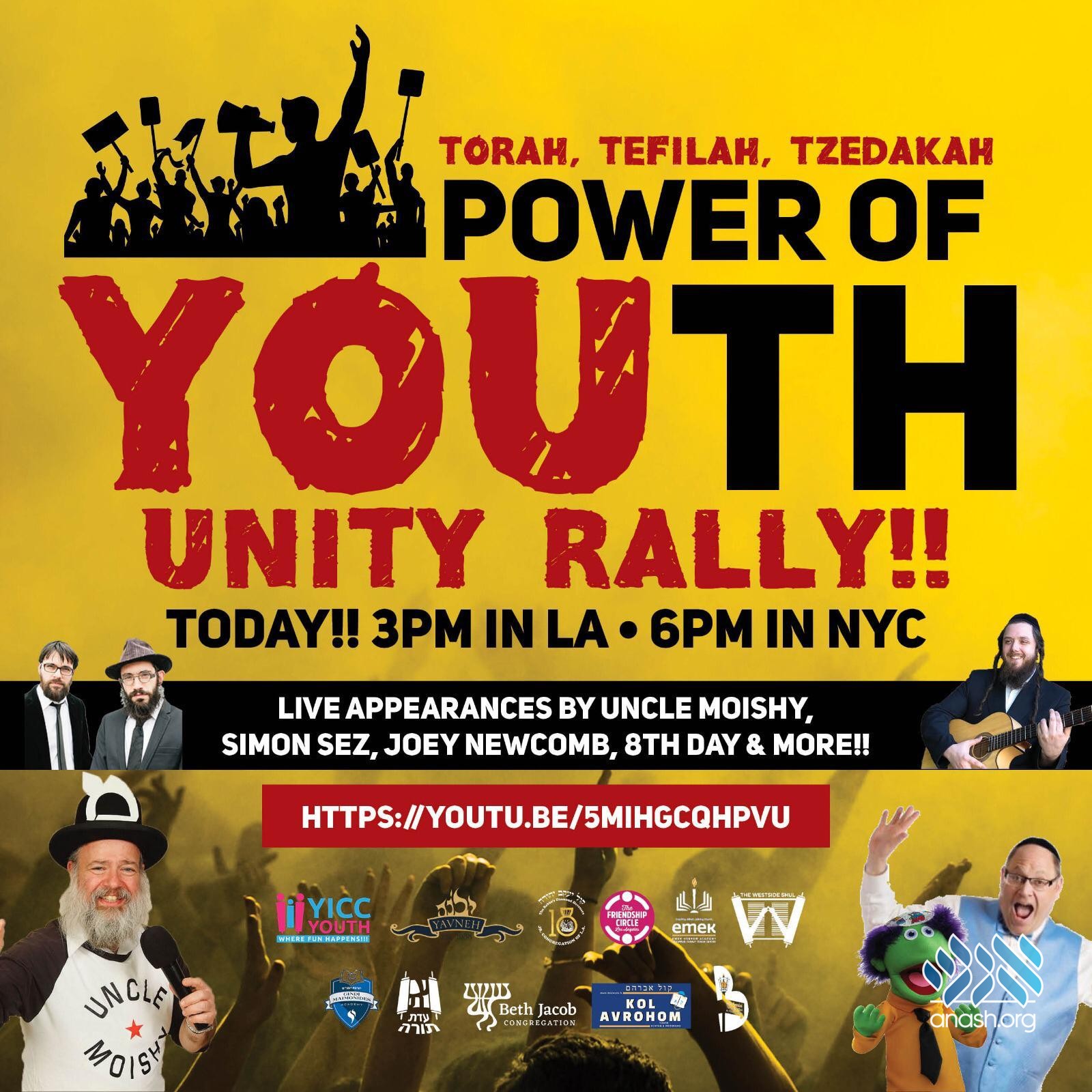 Watch live at 6:00 pm: A virtual rally of Torah, Tefillah and Tzedaka with songs by Uncle Moishy, 8th Day, Joey Newcomb and others.