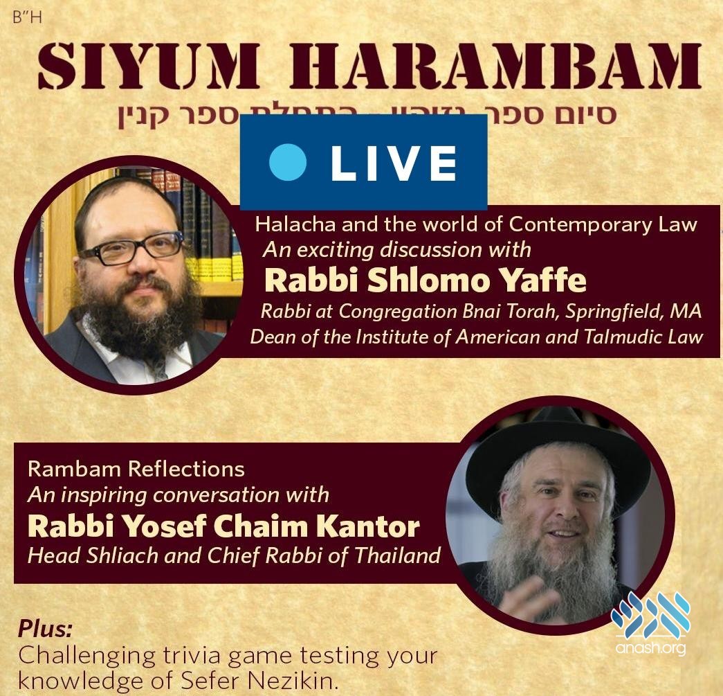 Join live at 9:00 PM ET: An international Siyum celebrating the completion of Sefer Nezikin will feature addressed by Rabbi Shlomo Yaffe, Dean of the Institute of American and Talmudic Law, and Rabbi Yosef Chaim Kantor, Head Shliach of Thailand.
