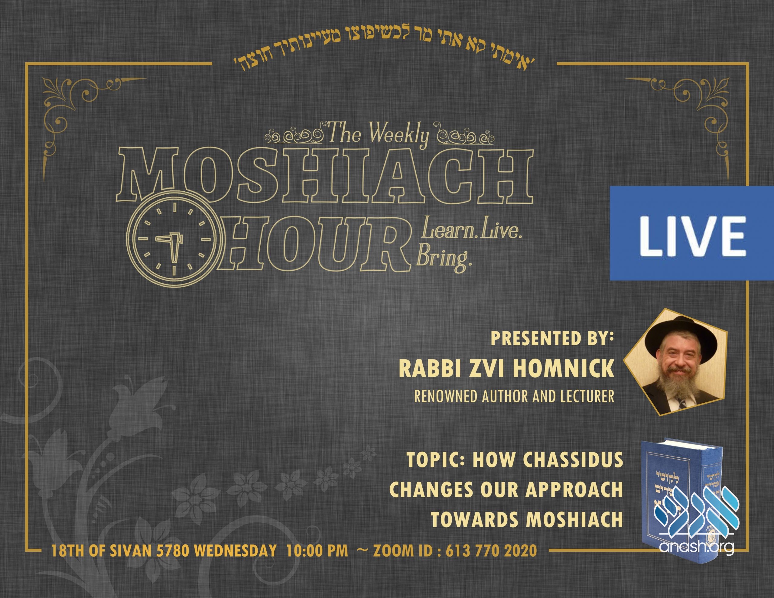 Join live at 10:00 PM: This week’s Moshiach Shiur will be given by Rabbi Zvi Homnick, a renowned Lecturer and writer.