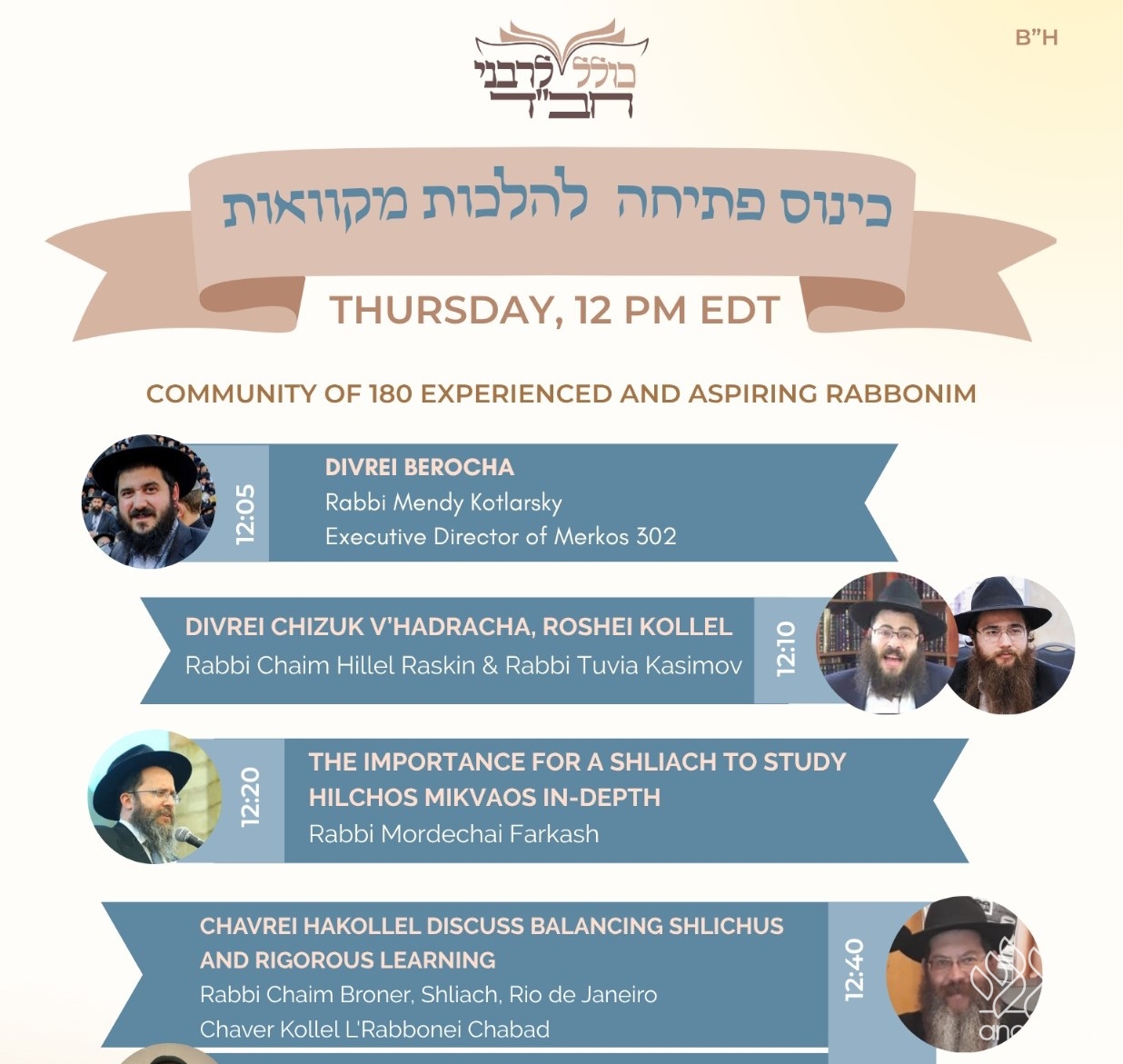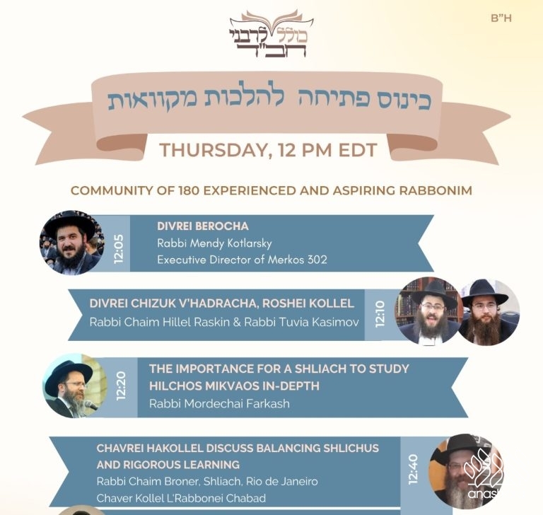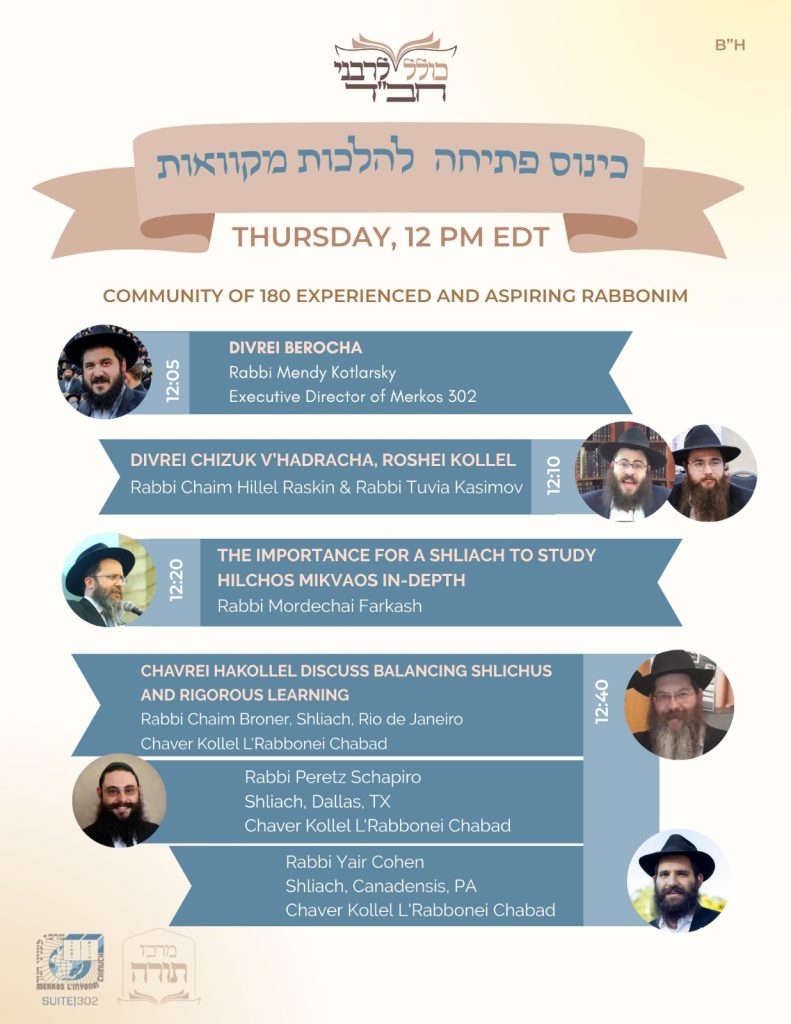 Join at 12 PM: Kollel L’Rabbonei Chabad invites to community of anash and shluchim to its first class of the new semester on Hilchos Milvaos.