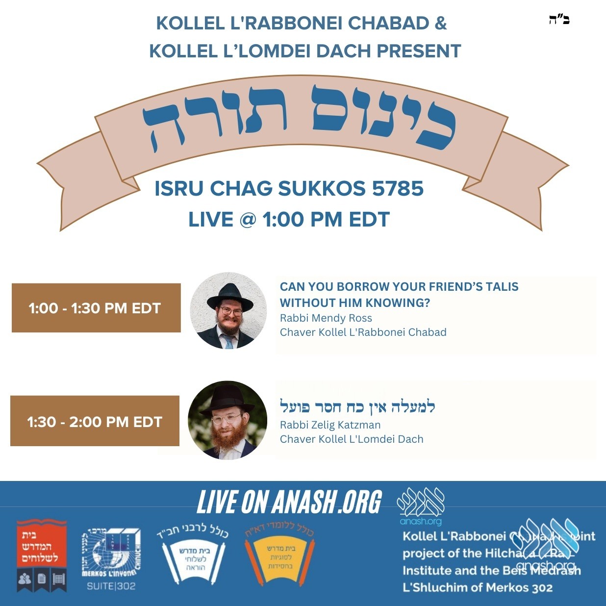 Join Live today at 1:00 PM: Kollel L’Rabbonei Chabad and Kollel Dach will be presenting a Kinus Torah, 25 Tishrei, addressed by Kollel members Rabbi Mendy Ross on borrowing a friend’s talis without asking and Rabbi Zelig Katzman on “Ein koach chaser poel.”