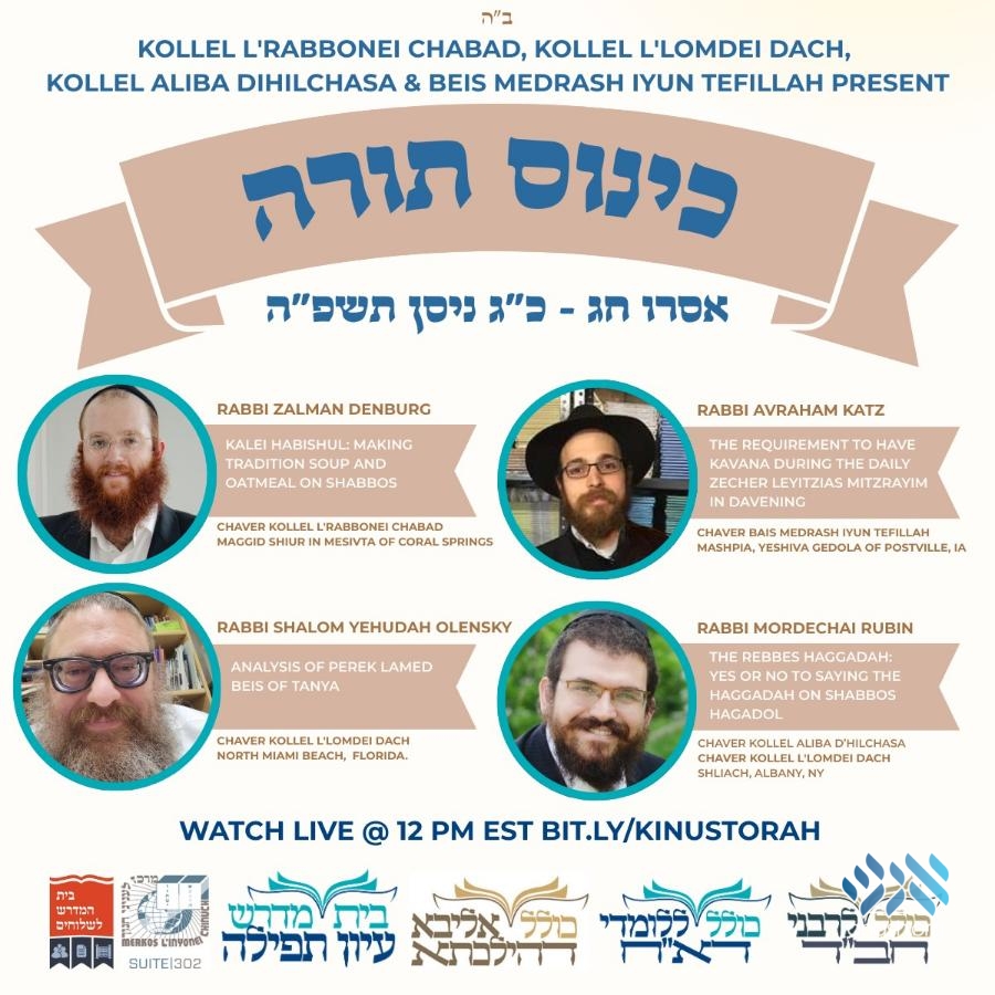The event is being hosted by Kollel L’Rabbonim Chabad, Kollel L’lomdei Dach, Kollel Aliba D’hilchasa, and Beis Medrash Iyun Tefillah, and will stream live at 12:00 PM EST.