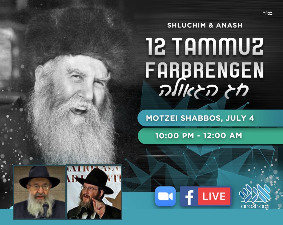 Join Live at 10:00 PM ET: Anash and Shluchim worldwide are invited to join a special virtual Farbrengen in celebration of Yud Beis-Yud Gimmel Tammuz with Rabbi Leibel Schapiro and Rabbi Yossi Lew.