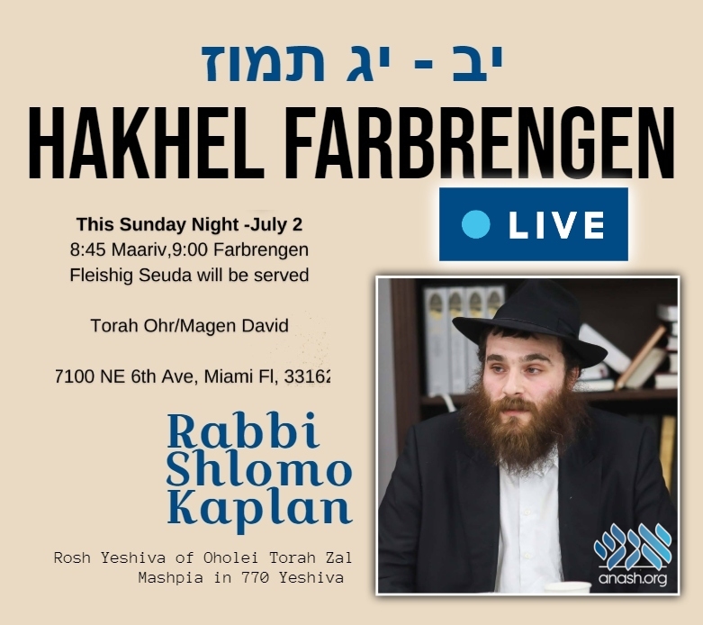 A farbrengen celebrating the birthday and chag hageulah of the Frierdiker Rebbe, will be broadcast tonight from North Miami Beach, led by Rabbi Shlomo Kaplan.