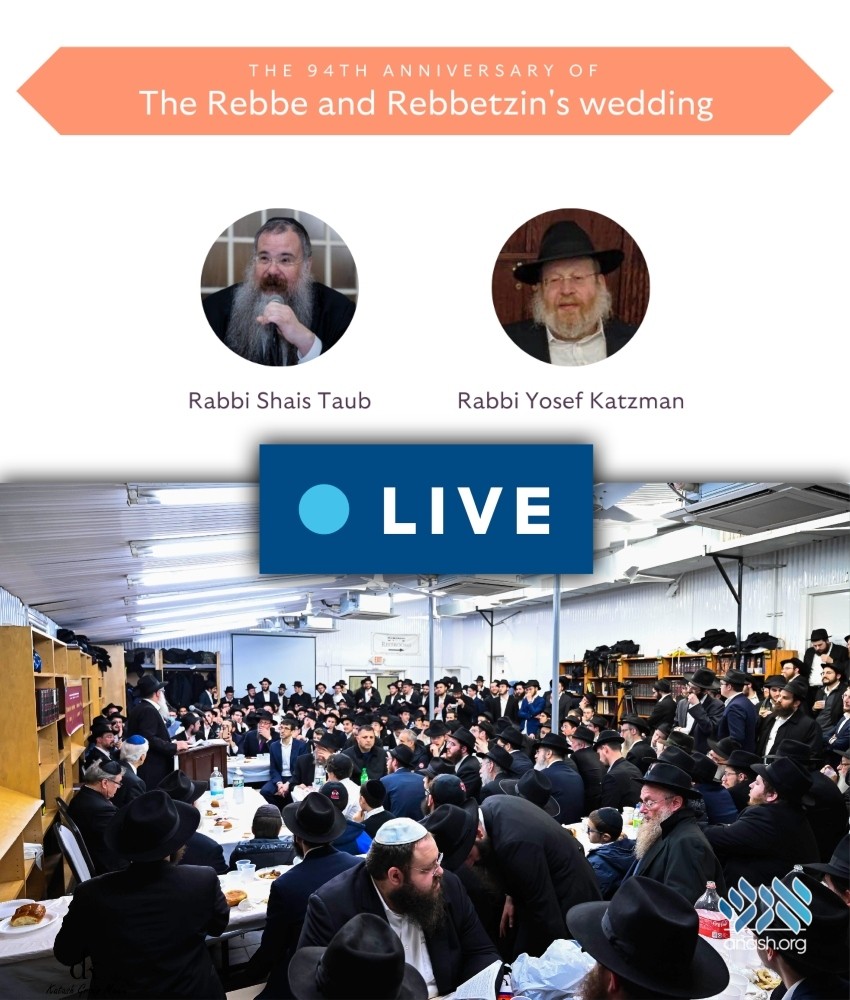 The Farbrengen will begin at 9:30 PM and will feature Rabbi Shais Taub and Rabbi Yosef Katzman and will be broadcasted LIVE at Chabad.org/OrVechom.
