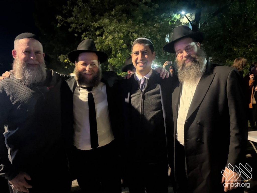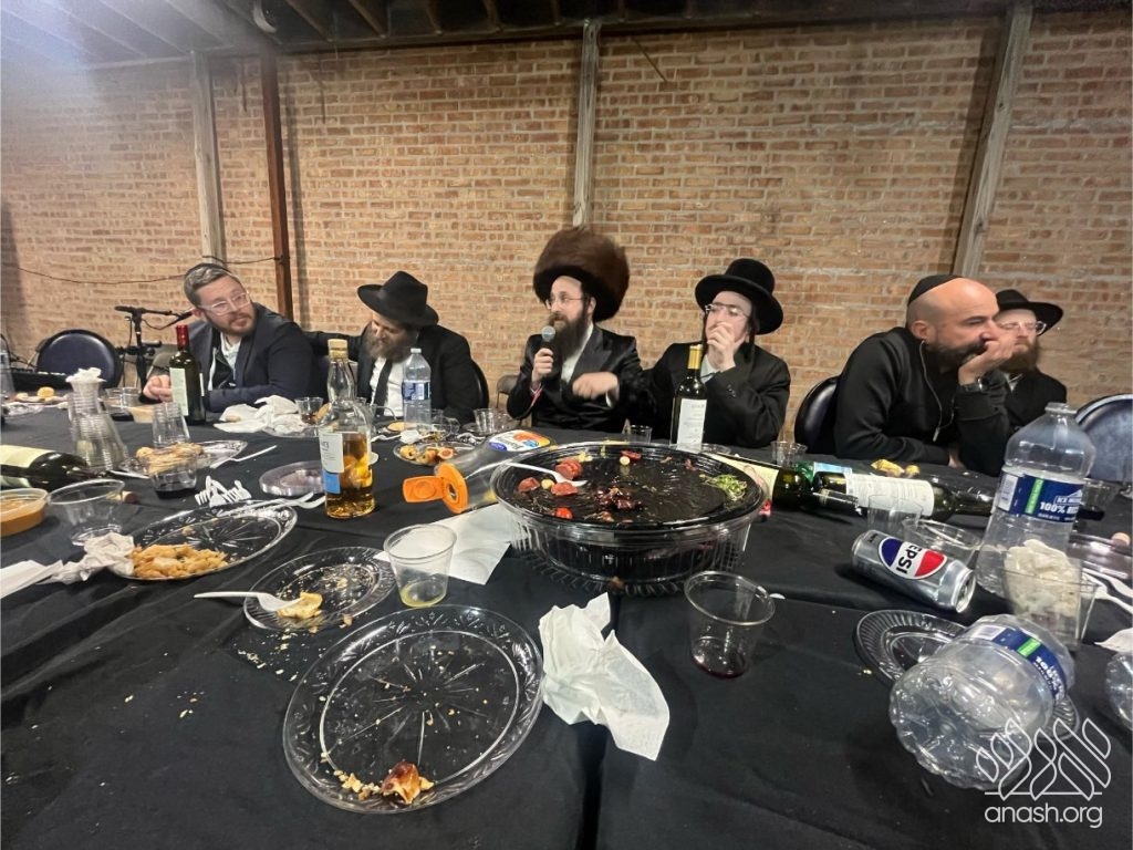 The Simchas Beis Hashoava continued with a special farbrengen in the sukkah until nearly 4 am, with hundreds of participants from across the community participating throughout the night. Joining Rabbi Baruch Hertz in speaking and farbrenging were Rabbi Zalman Leib Eichenstein—Rav of Zidichov; Rabbi Efraim Twerski—Rabbi of Congregation Khal Chasidim; Rabbi Yaakov Robinson—Executive Director of the Midwest Council of Synagogue Rabbonim at Agudath Israel of Illinois, and Rabbi of Mikor Hachaim; Rabbi Hershel Ungar—Rosh Kollel of the Veitzener Kollel; R’ Nesanel Gantz, a prominent Askan and one of the Directors of Yad L’Achim; and many other prominent Rabbonim and community leaders.