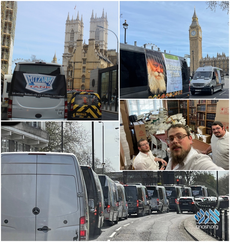 12 Mitzvah Tanks paraded through London a week before Pesach, passing by the city’s landmarks and bringing the message of Pesach to thousands.