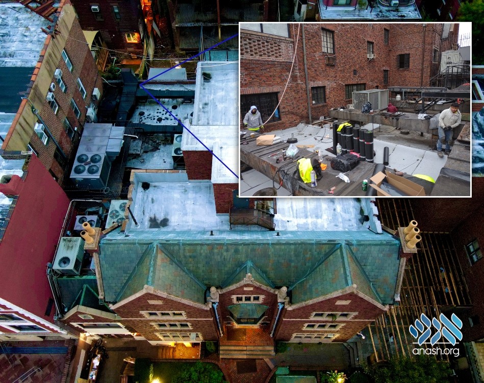 Workers began removing old air conditioning units and repairing the roof of the 770 shul to prevent any future leaks or flooding.