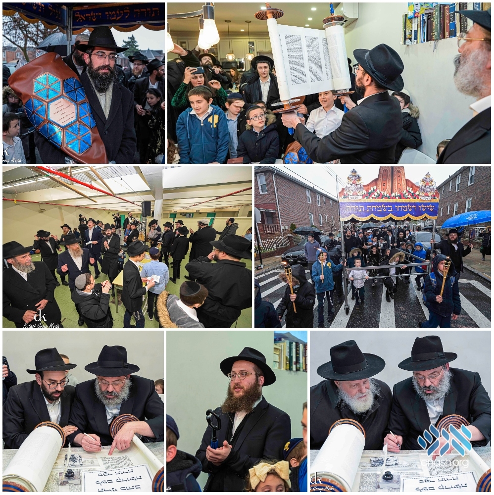 A large crowd gathered at 9029 Kings Highway for the writing of the final letters, followed by a procession to the new shul, despite the heavy rain. After arriving at the shul, hakafos and dancing continued for many hours.