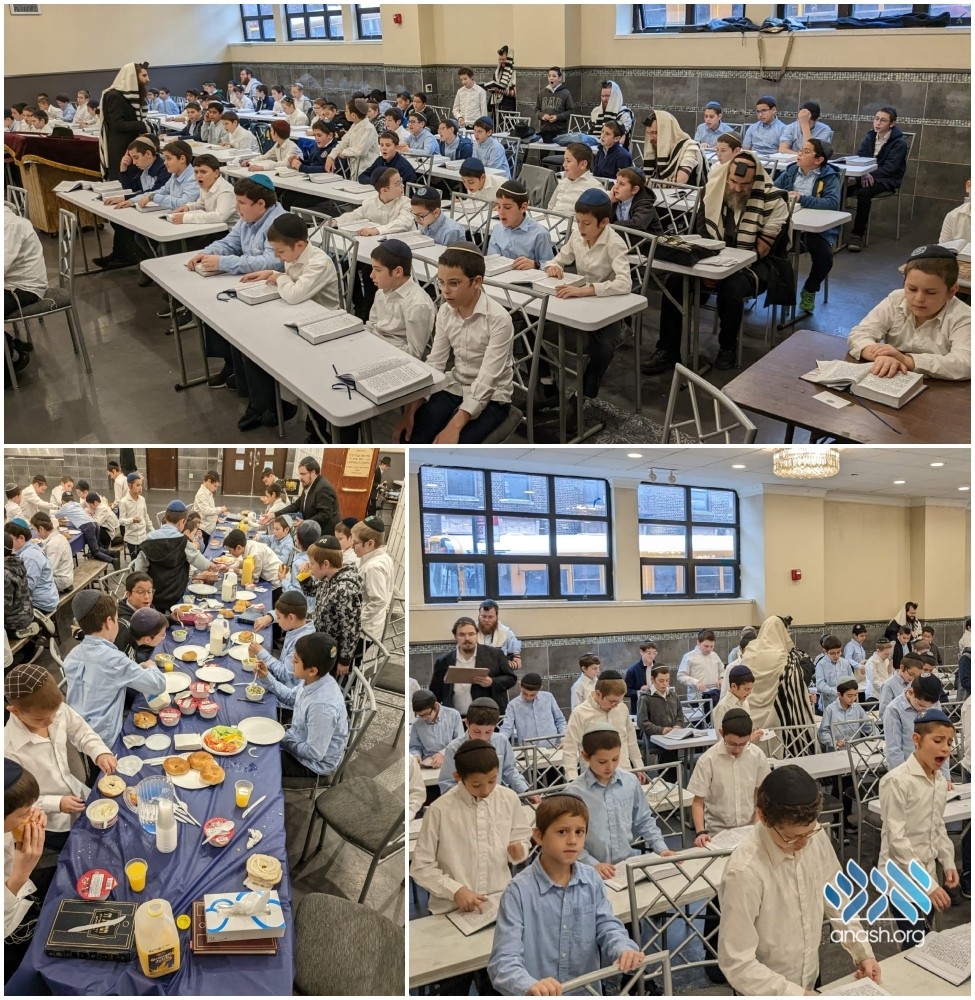 In honor of Rosh Chodesh Kislev and in the spirit of Hakhel, Lubavitcher Yeshiva Crown Street grades 5 and 6 held a special minyan and lavish breakfast seuda and farbrengen in honor of the special day.