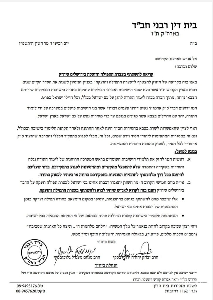 Beis Din Rabbonei Chabad in Eretz Yisroel has issued a public letter calling on Anash to take part in the Atzeres Tefillah Uze’akah to be held this Thursday, 8 Cheshvan, at the entrance to Yerushalayim. The massive demonstration, referred to as the “Million-Man Rally,” is being organized in response to the government’s proposed draft law and the recent arrests of yeshivah bochurim who have not enlisted in the army.