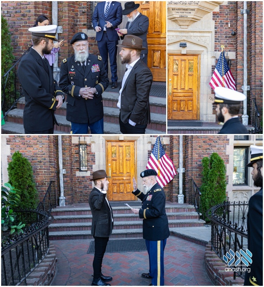 Lubavitcher Chanania Steinmetz was sworn in as a chaplain for the US Airforce by Chaplain Jacob Goldstein, at the entrance to 770 in Crown Heights.