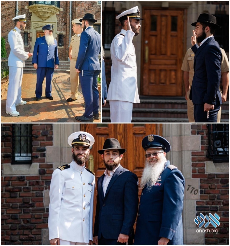 A crowd gathered at the unusual sight of three men in military dress and uniform in front of 770, watching as they welcomed Dovid to their ranks.
