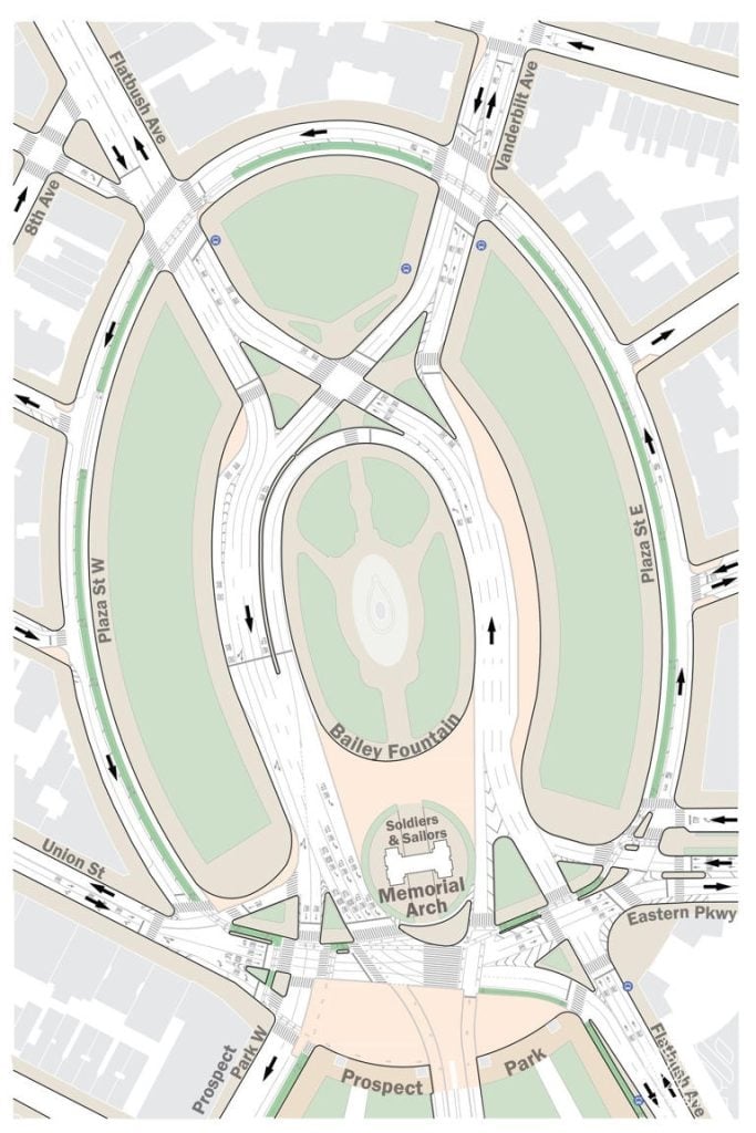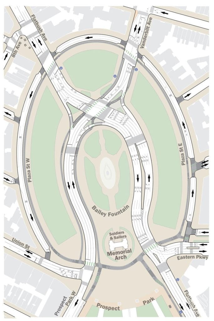 The redesign would reduce pedestrian-vehicle conflict points at the plaza from 31 to 20, convert the roadways looping around the arch from one-way to two-way streets, and reroute cars traveling between Union Street and Eastern Parkway around the northern side of the circle.
