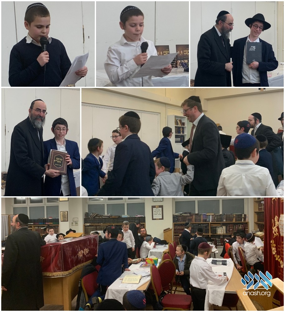 Rabbi Mendel Cohen, the Rov of The Minyan in Beis Menachem and Menahel of the Oholei Yosef Yitzchok Lubavitch Boys School spoke to the boys. He thanked Rabbi Niasoff for dedication to the project and presented him with a set of seforim on behalf of all the boys and parents as a token of gratitude.