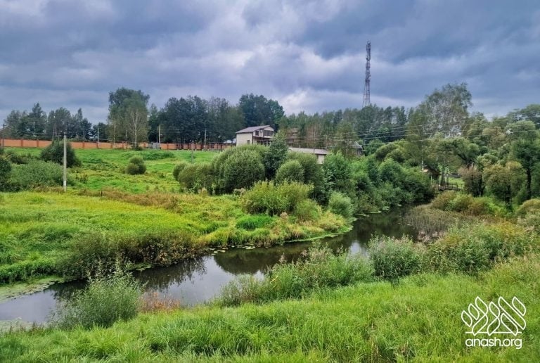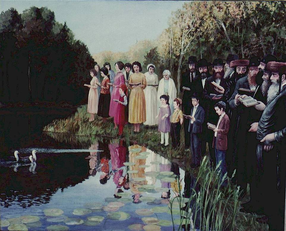 Meanwhile, around the Lubavitcher river, it is already lively. The town gathers early—young and old, feeble old men and nursing babies… They gather on the left side of the river, on the low, bright sunlight bank, where the yeshivah bochurim had spent the whole summer swimming and splashing. Now the left bank is filled with the idle folk of the shtetl, curious girls and boys, mischievous children who gathered early to witness the beautiful, grand tashlich procession of the Lubavitcher chatzer.