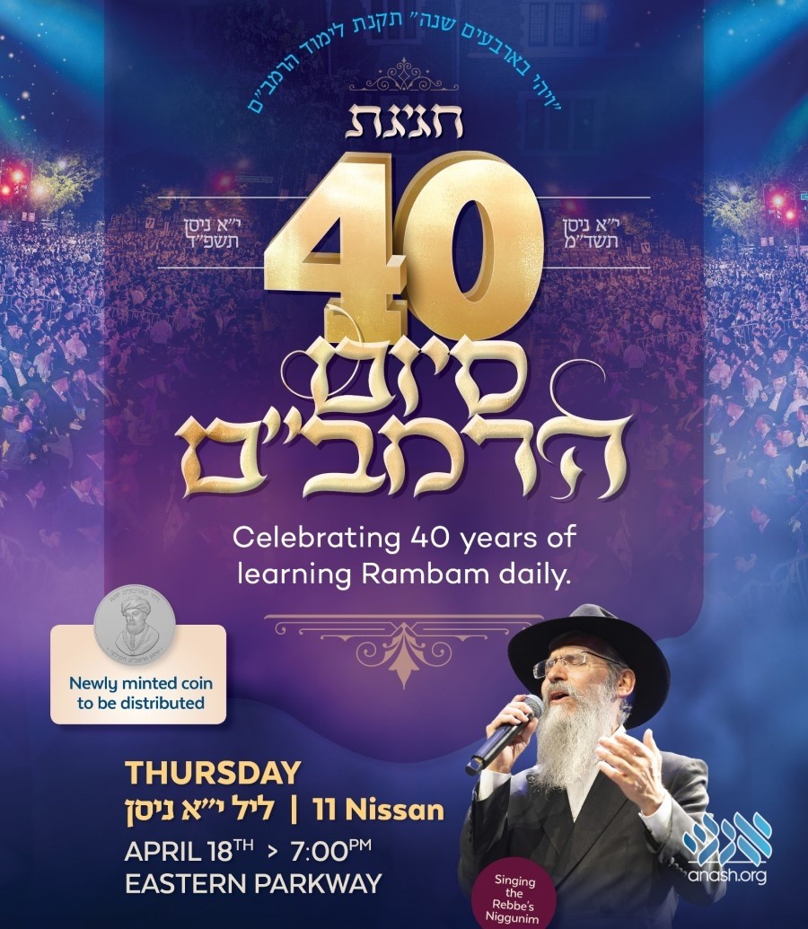 In a monumental celebration of Rambam learning and Achdus, the Siyum Horambam of 40 years is scheduled for Yud Alef Nissan outside 770 with the entire Eastern Parkway closed off.