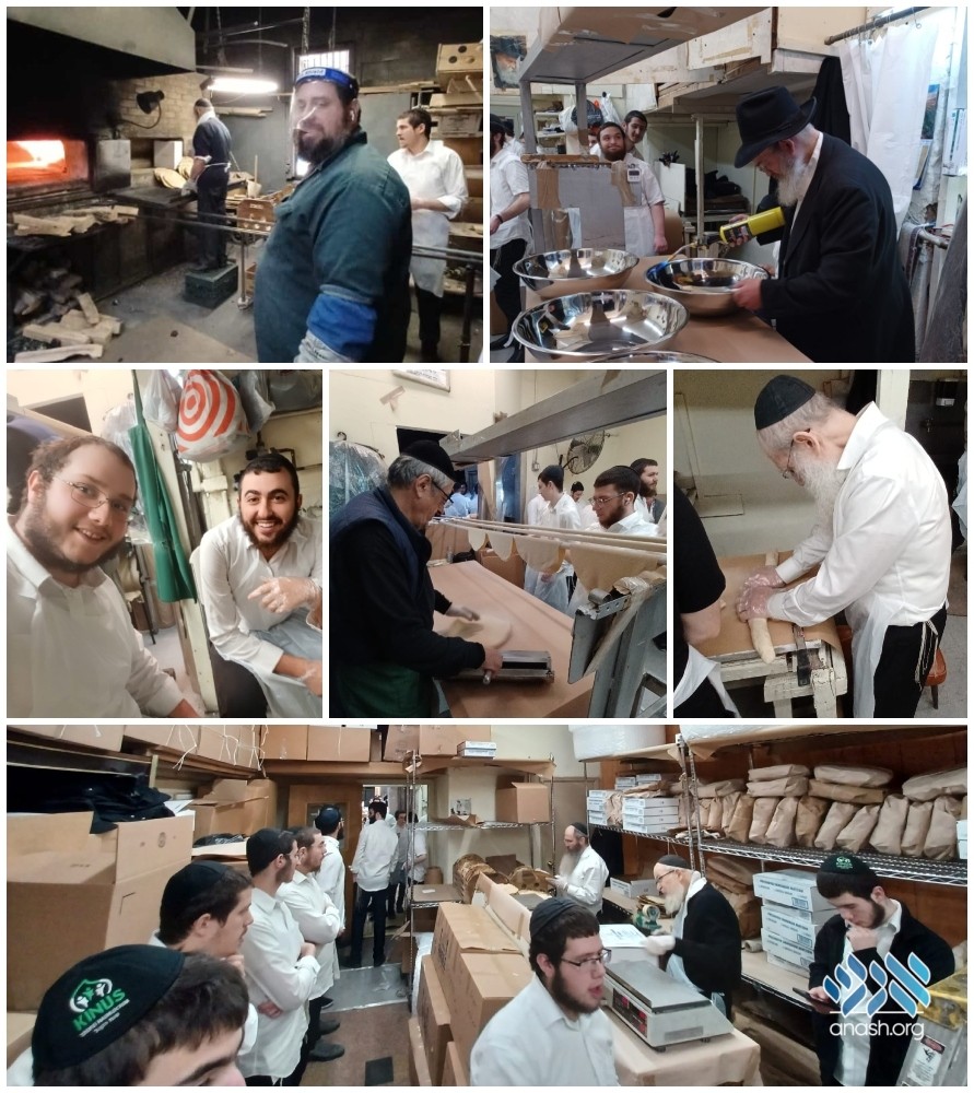 A chabura of Oholei Torah Bochurim and staff led by Rabbi Nachman Schapiro took up posts at the Lubavitch Matza Bakery in Crown Heights, to prepare had-baked Shmura Matza for the days of Pesach.