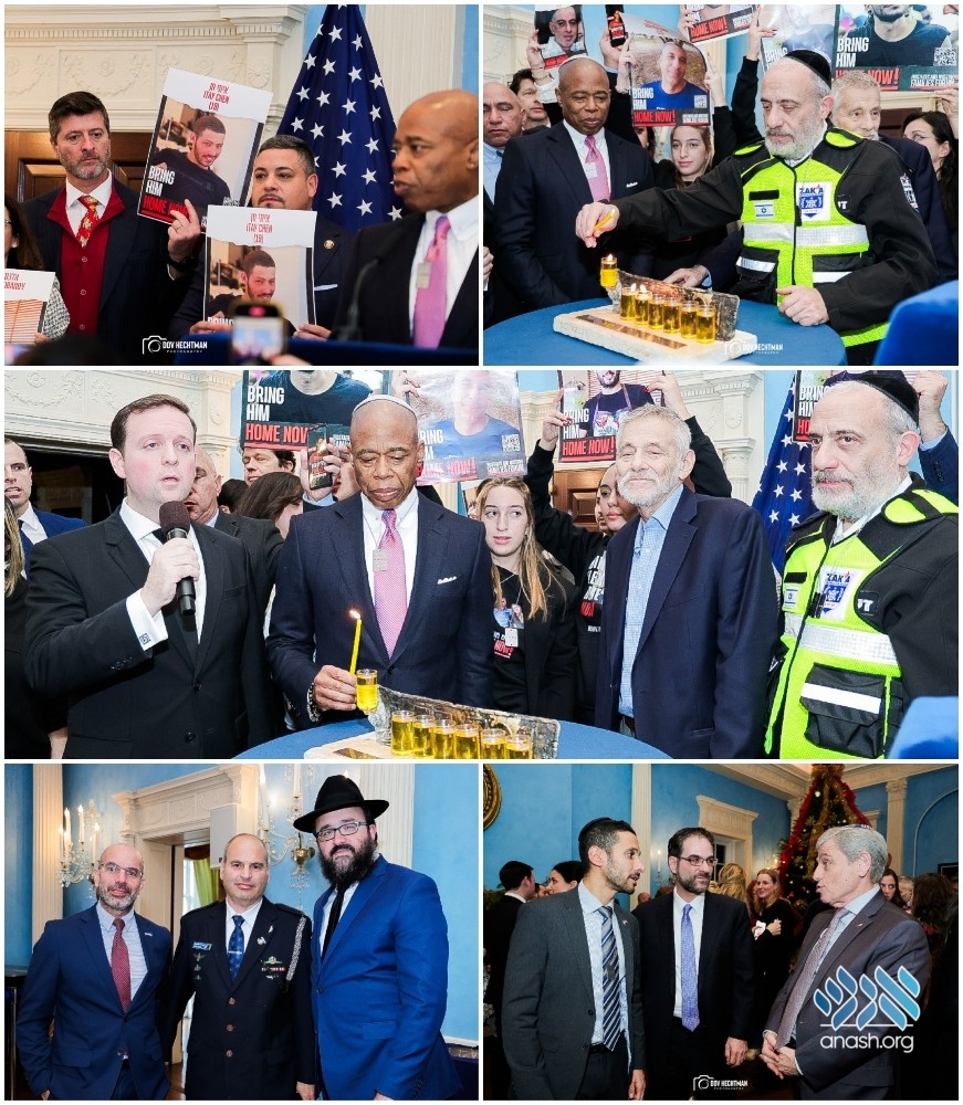 New York City Mayor Eric Adams hosted Jewish community leaders for a Chanuka celebration at Gracie Mansion on Tuesday night, including family members of Israelis held hostage by Hamas, since October 7th.
