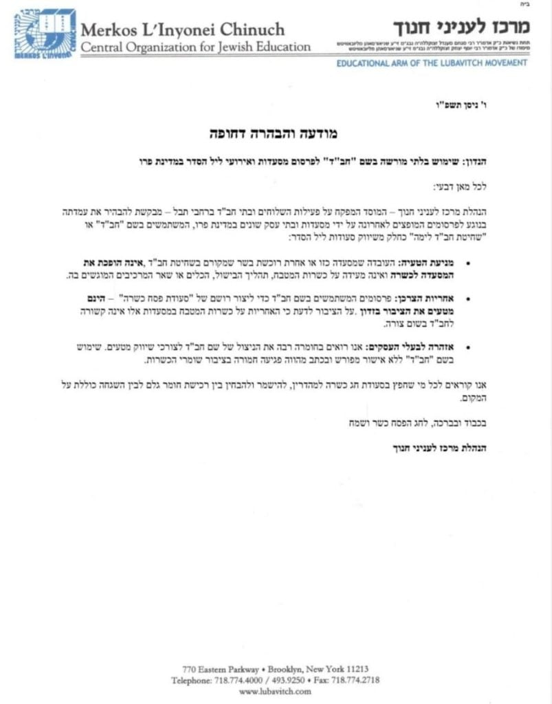 Merkos also warned business owners directly: “We view with great seriousness the exploitation of the Chabad name for deceptive marketing purposes. Using the name ‘Chabad’ without explicit written authorization constitutes a serious harm to the needs of those who observe kashrus.”