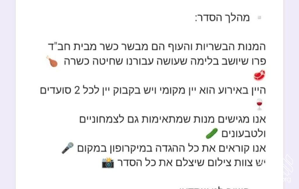 Yet in the same promotional message, the restaurant noted that the Haggadah would be read via microphone throughout the event and that a camera crew would be documenting the entire evening. In addition, the wine, advertised as locally made, would be yayin nesech.