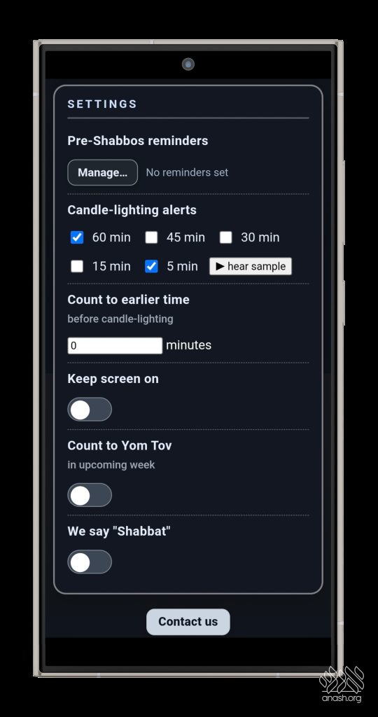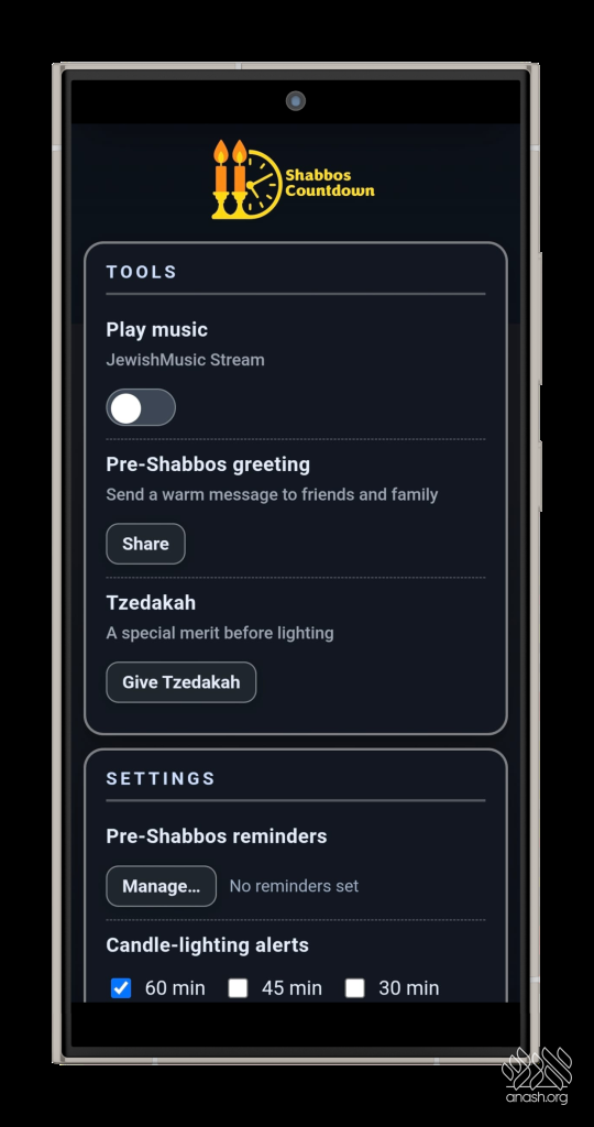 • Custom Reminders — Create personalized reminders for important Erev Shabbos tasks such as covering light switches, filling the urn, or checking coat pockets.