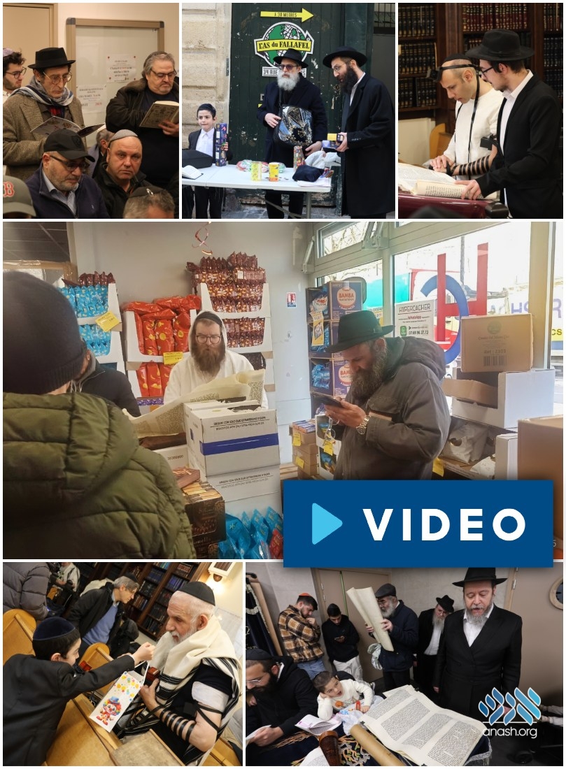 Tens of thousands of French Jews heard the Megilah at readings in community shuls, Chabad Houses, street corners and supermarkets, as Anash and bochurim of Paris spread out to merit their brothers and sisters in the mitzvos of Purim.