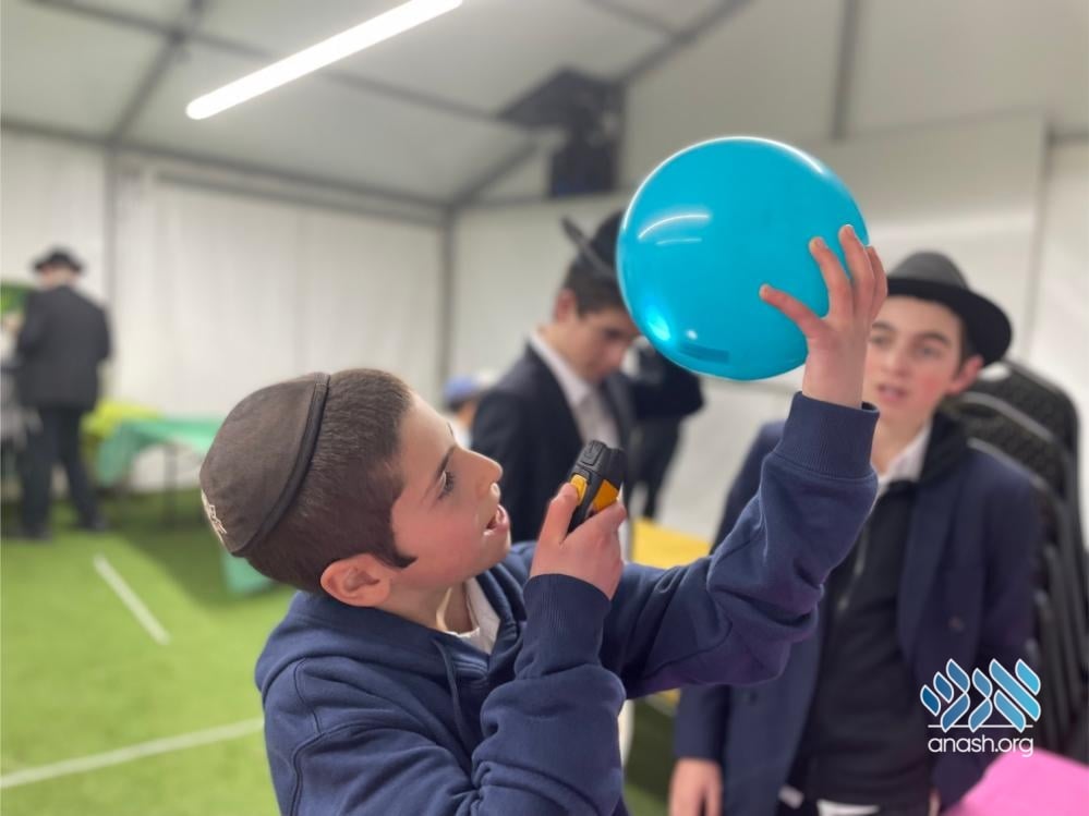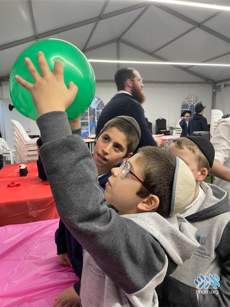 There was an evening program with a vibrant carnival bursting with creativity. Each activity tied to the themes of Chai Elul, the Baal Shem Tov and the Alter Rebbe. Examples include digging through sand to uncover a hidden key that unlocked handcuffs, and peaking through balloons to decode messages from Tanya.