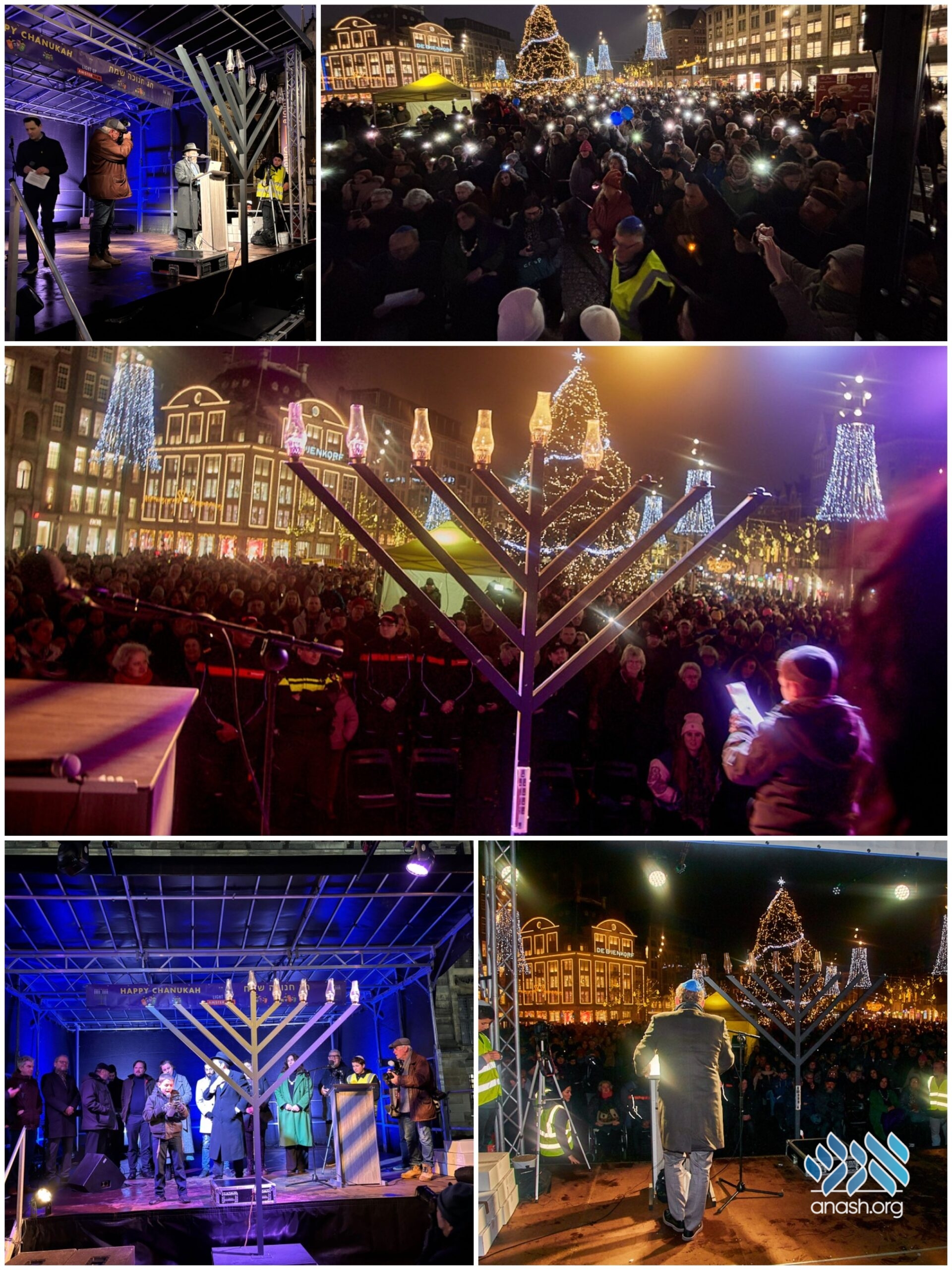 In front of the Netherlands Royal Palace in the iconic Dam Square, Shliach Rabbi Menachem Evers organized a Menorah lighting event featuring music, dancing, and inspiring speeches. Caroline van der Plas, from the popular Farmer Movement, praised the Jewish community and encouraged them to continue shining their light.