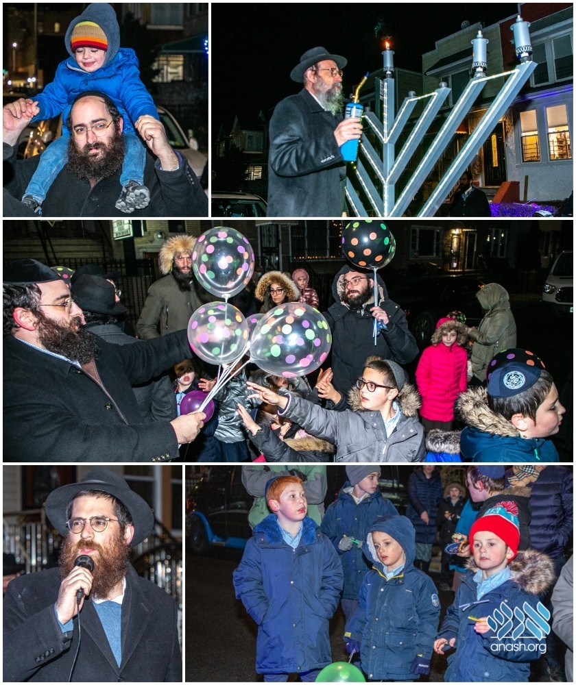 Families from East Flatbush and South Crown Heights gathered for a grand Menorah lighting and Hakhel on East 37th St., with music, donuts, and a program from children.
