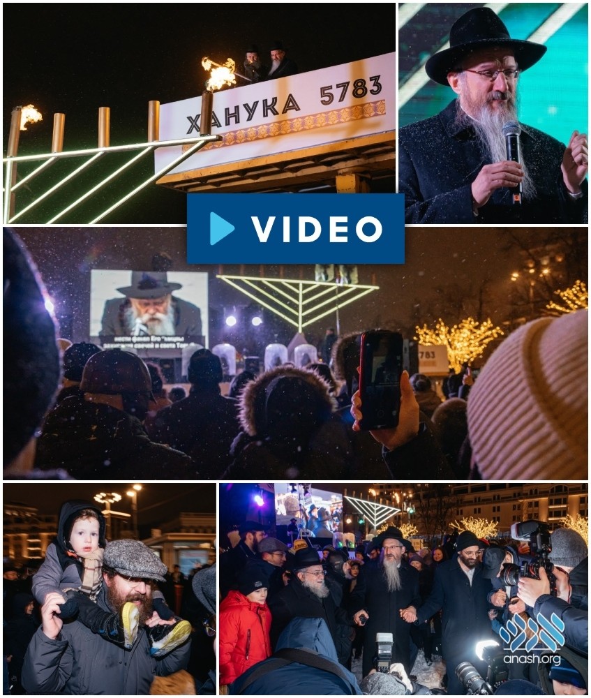 The menorah was kindled by Russia’s Chief Rabbi Berel Lazar, followed by lively Chanukah music and a video of the Rebbe.