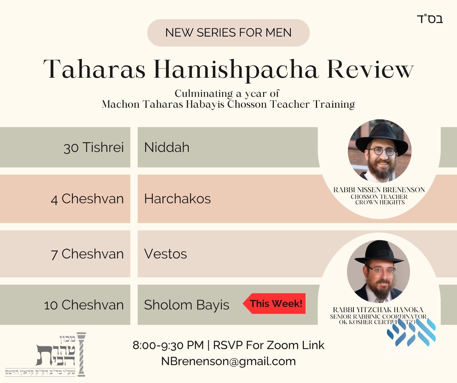 The Taharas Hamishpocha reviews series for men recently launched by Machon Taharas Habayis will be holding a special Sholom Bayis Zoom class tonight.