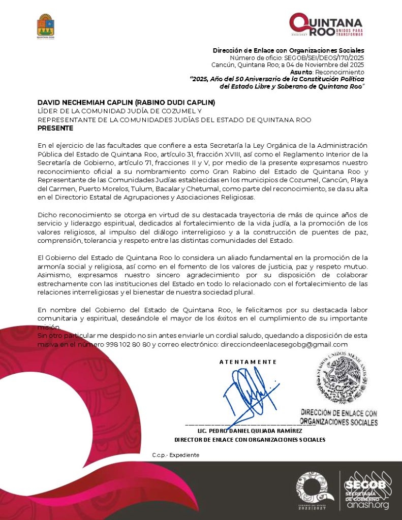 The official appointment, endorsed by government officials and members of the Jewish community, marks a major milestone for Chabad in Mexico. Rabbi Caplin, who has been serving the local residents and tourists for many years, will continue to expand his work in other cities across the state.